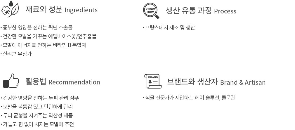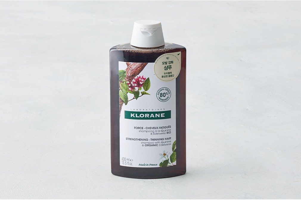 엄선한 원료와 식물 전문가의 노하우가 담긴 클로란의 퀴닌 에델바이스 샴푸를 소개할게요. 신코나 나무껍질에서 추출한 특허 성분인 퀴닌 추출물*과 에델바이스 성분이 풍부한 영양을 전해주고요. 판테놀과 바이오틴 등을 함유하는 비타민 B 복합체는 모발을 볼륨 있고 탄탄하게 관리해줍니다. 자극받고 지친 두피와 가늘고 힘 없는 모발 때문에 고민이었던 분들에게 특히 추천할게요.