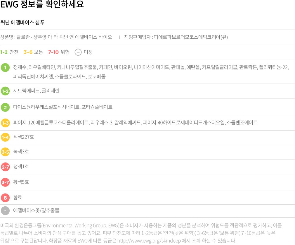 EWG에 대한 컬리의 생각 컬리는 화장품,샴푸,치약,세제 등 우리의 인체에 닿는 리빙 제품의 전성분을 공개하고 성분의 위험 정도를 EWG 기준에 따라 1~10 숫자로 안내하고 있습니다. EWG가 세계적으로 널리 사용되는 신뢰할 수 있는 척도인 것은 맞지만,상품의 안전성을 증명하는 절대적인 기준은 아니에요. EWG로부터 좋지 못한 평가를 받은 성분에 대해 전문가와 유관기관은 '권고 기준치를 지켜 사용할 경우 무해하다'고 평가하기도 합니다. 이에 컬리는 EWG 등급과 인터넷에 떠도는 단편적인 정보에만 의존하지 않고 식품의약품안전처,에코서트(ECOCERT),미국식품의약국(FDA),미국화장품원료검토위원회(CIR)등 공신력 있는 인증기관의 의견을 참고하여 유해성 여부를 꼼꼼하게 따져 보고 있습니다.