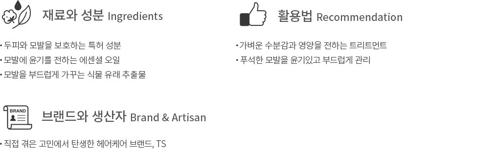 직접 겪은 고민을 바탕으로 진정성이 담긴 제품을 선보이는 헤어케어 브랜드,TS의 프리미엄 TS 트리트먼트를 소개할게요. 5가지의 식물추출물을 함유하는 특허 성분*이 두피와 모발을 건강하게 보호해주고요. 에센셜 오일과 여러 식물 유래 추출물은 푸석한 모발에 풍부한 수분과 부드러운 윤기를 더해줍니다. 답답함 없이 가볍고 깔끔하게 사용할 트리트먼트를 찾으셨던 분들에게 특히 추천할게요.