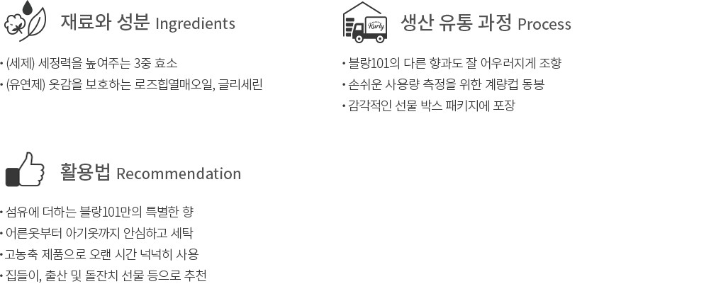 블랑101은 항상 성분에 대해 고민합니다. 성분은 곧 온 가족이 마음 놓고 사용할 수 있는 상품이 가져야 할 가장 기본이니까요. 때문에 블랑101은 아무리 상품을 매력적으로 돋보일 수 있더라도,불필요한 성분이라면 최대한 배제한다는 신념으로 제품을 연구하고 있습니다. 굳이 강조하지 않더라도 자극적이지 않고 순한 사용감을 선사하는 것은 당연한 일이겠지요. 환경을 조금 더 생각하고,기본에 충실한 블랑101의 세제를 만나보세요.