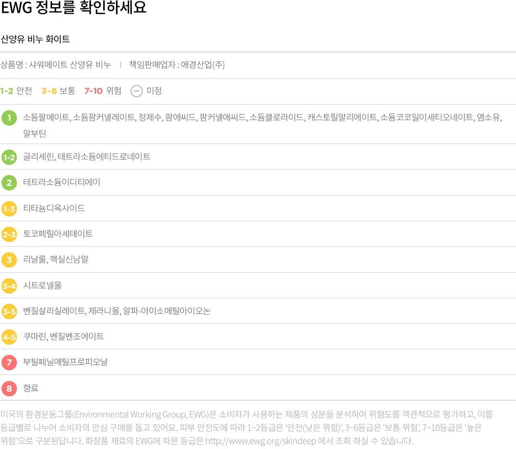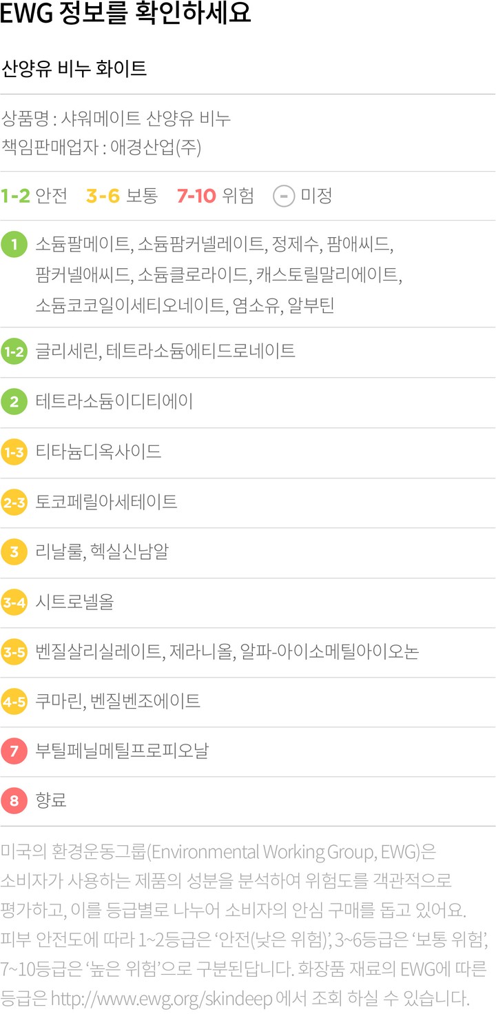 컬리는 EWG로부터 보통,위험 등급을 받은 성분이라 하더라도 숨기지 않고 정직하게 공개합니다. 더불어 우려되는 성분에 대한 정보를 함께 제공해 드리오니 구입 전 반드시 확인해 주세요.