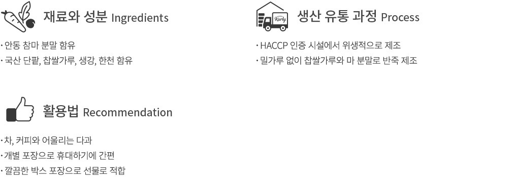 바사삭 소리만 들어도 저절로 향수를 불러일으키는 간식이 있어요. 쫀득한 팥소에 담긴 진한 달콤함이 매력적인 과자,모나카예요. 이번에는 안동 참마 분말과 생강이 더해져 깔끔한 맛을 자랑하는 모나카를 준비했어요. 단팥과 찹쌀가루,마 분말과 생강 모두 국산 재료를 사용했지요. 밀가루와 보존료는 일절 넣지 않았으니 안심하셔도 좋아요. 모나카 5개를 깔끔한 박스에 담아 가벼운 선물로 건네기에도 좋고,낱개 포장해서 언제 어디서든 간식으로 챙겨 먹기에도 제격이랍니다.
