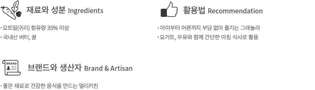 ・특징:애플칩을 넣어 새콤달콤함을 살린 그래놀라예요. 고소하면서도 은은하게 감도는 달콤함이 매력적이랍니다.