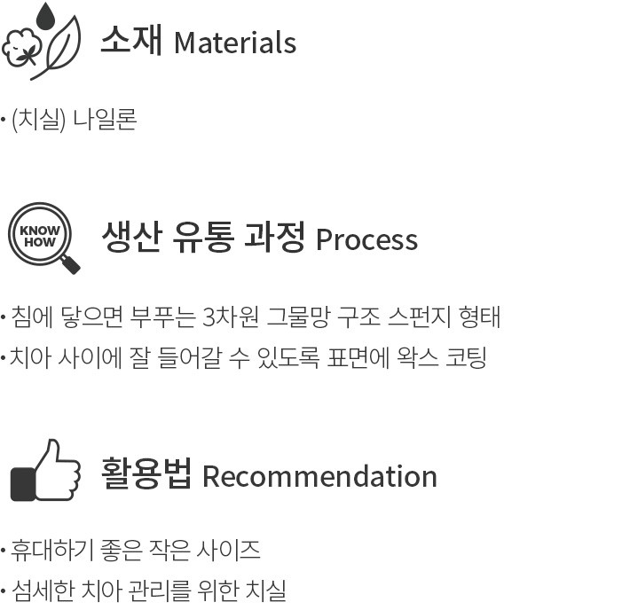 ・사용감:도톰한 스펀지로 변하면 치아 사이에 촘촘히 들어가 부드럽게 사용할 수 있습니다.