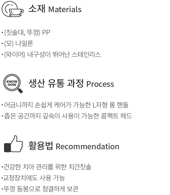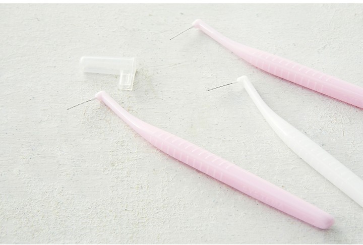 ・특징:0.8mm의 두께로 앞니처럼 좁은 곳에 사용하기 좋은 치간칫솔이에요. L자형 치간칫솔 5개와 보관용 캡 1개로 구성했습니다.