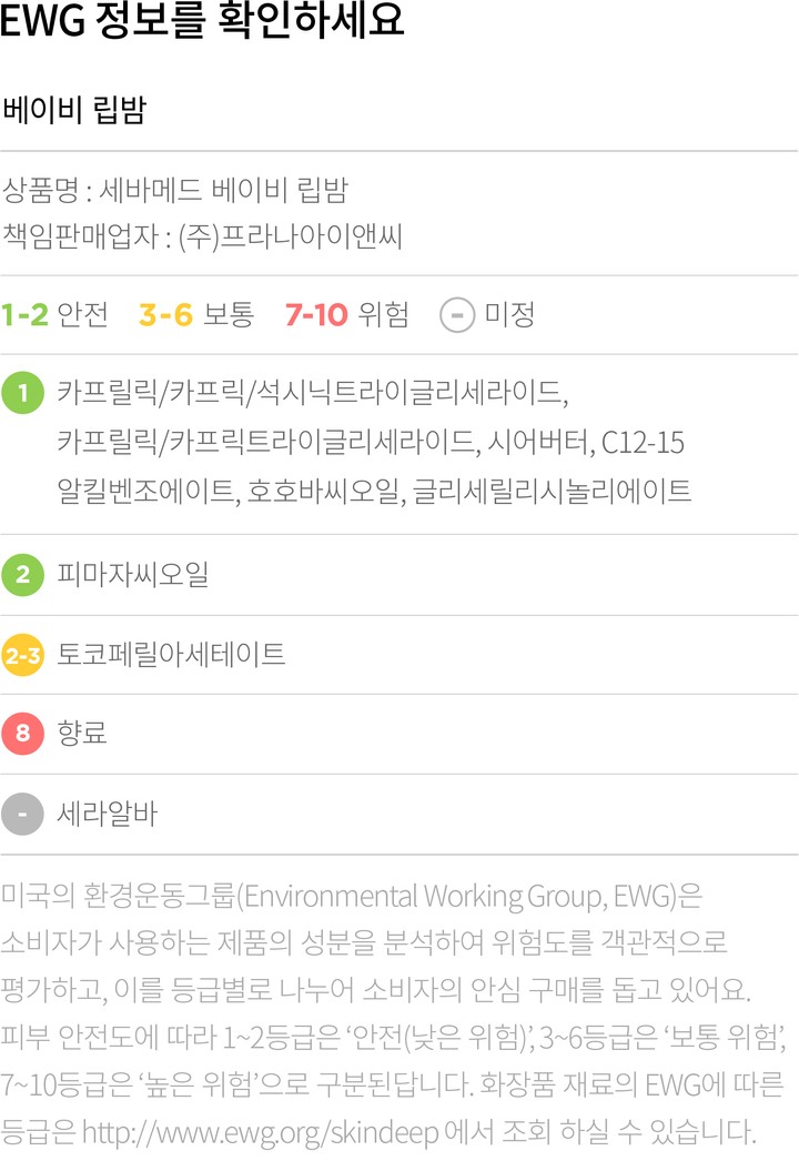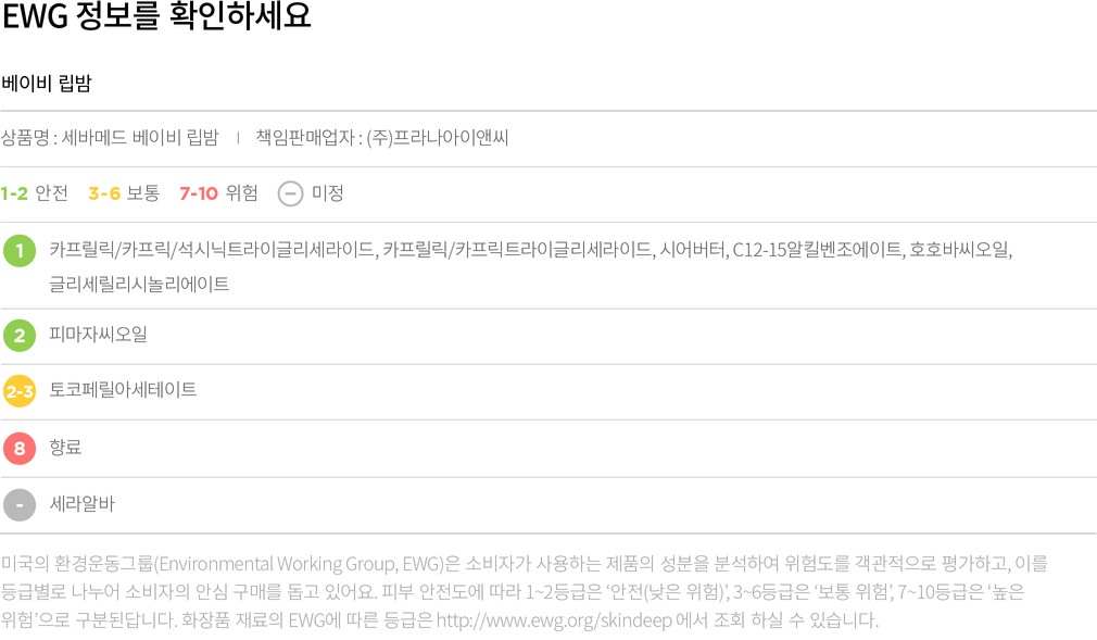 EWG에 대한 컬리의 생각 컬리는 화장품,샴푸,치약,세제 등 우리의 인체에 닿는 리빙 제품의 전성분을 공개하고 성분의 위험 정도를 EWG 기준에 따라 1~10 숫자로 안내하고 있습니다. EWG가 세계적으로 널리 사용되는 신뢰할 수 있는 척도인 것은 맞지만,상품의 안전성을 증명하는 절대적인 기준은 아니에요. EWG로부터 좋지 못한 평가를 받은 성분에 대해 전문가와 유관기관은 '권고 기준치를 지켜 사용할 경우 무해하다'고 평가하기도 합니다. 이에 컬리는 EWG 등급과 인터넷에 떠도는 단편적인 정보에만 의존하지 않고 식품의약품안전처,에코서트(ECOCERT),미국식품의약국(FDA),미국화장품원료검토위원회(CIR)등 공신력 있는 인증기관의 의견을 참고하여 유해성 여부를 꼼꼼하게 따져 보고 있습니다.
