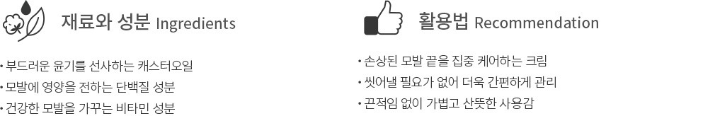 ・ 사용감:빠르게 흡수되어 모발이 부드럽고 차분해져요. 손에 남거나 끈적이는 느낌 없이 산뜻한 느낌이에요.