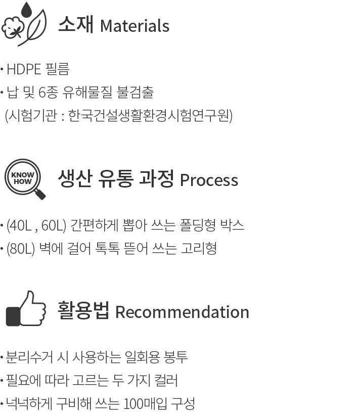 ・특징:80L 용량의 분리수거용 봉투로 부피가 큰 플라스틱이나 캔 등을 넉넉하게 모아 버릴 수 있어요. 한 장씩 뽑아 쓰기 좋은 박스 패키지에 담아 보내드려요.
