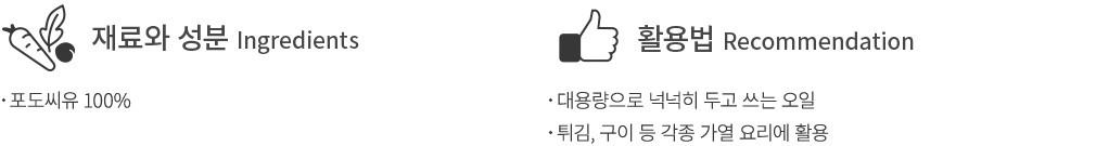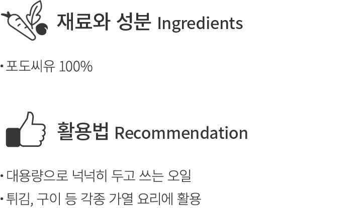 ・특징:맛과 향이 깔끔한 포도씨유로,발연점이 높아 다양한 요리에 활용하기 좋아요.