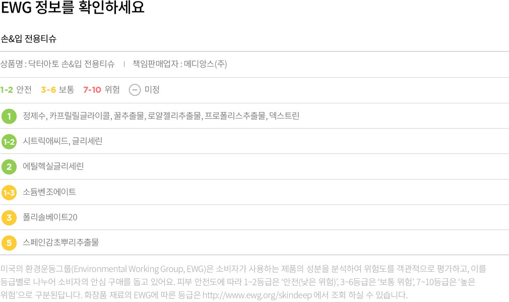 EWG에 대한 컬리의 생각 컬리는 화장품,샴푸,치약,세제 등 우리의 인체에 닿는 리빙 제품의 전성분을 공개하고 성분의 위험 정도를 EWG 기준에 따라 1~10 숫자로 안내하고 있습니다. EWG가 세계적으로 널리 사용되는 신뢰할 수 있는 척도인 것은 맞지만,상품의 안전성을 증명하는 절대적인 기준은 아니에요. EWG로부터 좋지 못한 평가를 받은 성분에 대해 전문가와 유관기관은 '권고 기준치를 지켜 사용할 경우 무해하다'고 평가하기도 합니다. 이에 컬리는 EWG 등급과 인터넷에 떠도는 단편적인 정보에만 의존하지 않고 식품의약품안전처,에코서트(ECOCERT),미국식품의약국(FDA),미국화장품원료검토위원회(CIR)등 공신력 있는 인증기관의 의견을 참고하여 유해성 여부를 꼼꼼하게 따져 보고 있습니다.