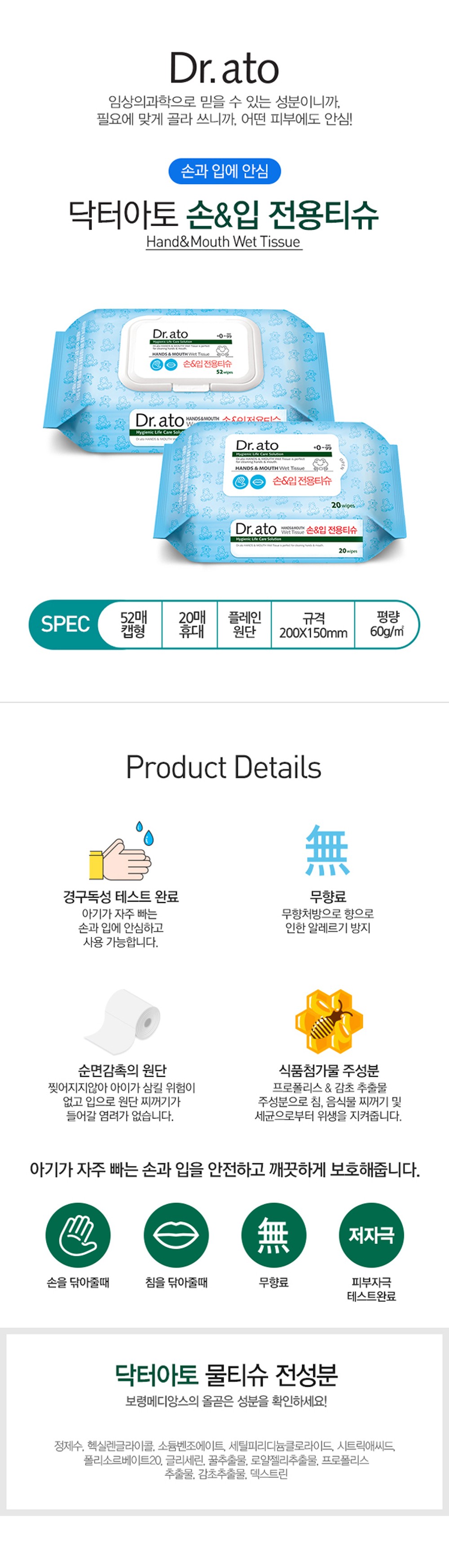 우리 피부에 자주 닿는 손이나 예민한 부위에 사용하는 물티슈는 성분부터 원단까지 더욱 꼼꼼하게 골라야 해요. 닥터아토의 손&입 전용티슈를 만나보세요. 도톰한 플레인 원단으로 피부에 부드럽게 닿고요. 급성경구독성시험을 완료해 손을 자주 빠는 아이도 안심이죠. 가방에 쏙 챙겨가기 좋은 20매로 준비했으니,손이나 입가를 언제든 깨끗하게 관리해보세요.