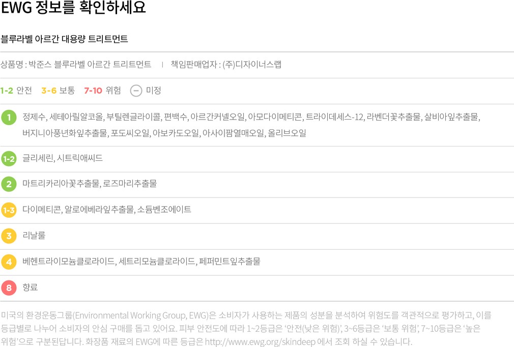 EWG에 대한 컬리의 생각 컬리는 화장품,샴푸,치약,세제 등 우리의 인체에 닿는 리빙 제품의 전성분을 공개하고 성분의 위험 정도를 EWG 기준에 따라 1~10 숫자로 안내하고 있습니다. EWG가 세계적으로 널리 사용되는 신뢰할 수 있는 척도인 것은 맞지만,상품의 안전성을 증명하는 절대적인 기준은 아니에요. EWG로부터 좋지 못한 평가를 받은 성분에 대해 전문가와 유관기관은 '권고 기준치를 지켜 사용할 경우 무해하다'고 평가하기도 합니다. 이에 컬리는 EWG 등급과 인터넷에 떠도는 단편적인 정보에만 의존하지 않고 식품의약품안전처,에코서트(ECOCERT),미국식품의약국(FDA),미국화장품원료검토위원회(CIR)등 공신력 있는 인증기관의 의견을 참고하여 유해성 여부를 꼼꼼하게 따져 보고 있습니다.