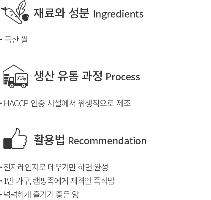 밥을 짓기 귀찮을 때 즉석밥만한 효자가 없어요. 전자레인지에 데우기만 하면 김이 모락모락 나는 밥이 바로 완성되니까요. 찬장에 구비해두면 마음이 든든한 제품,오뚜기의 맛있는 밥을 담아가 보세요. 이번에는 기존 오뚜기밥 대비 넉넉한 양을 담아 푸짐하게 즐길 수 있는 큰밥을 준비했는데요. 정직한 국산 쌀을 사용해 더욱 안심하고 즐길 수 있지요. 4개입으로 보내드리니 따끈한 쌀밥을 어디서든 간편하게 누려 보세요. 집에서도 좋지만 캠핑장,여행지에서 더욱 빛을 발할 거예요.