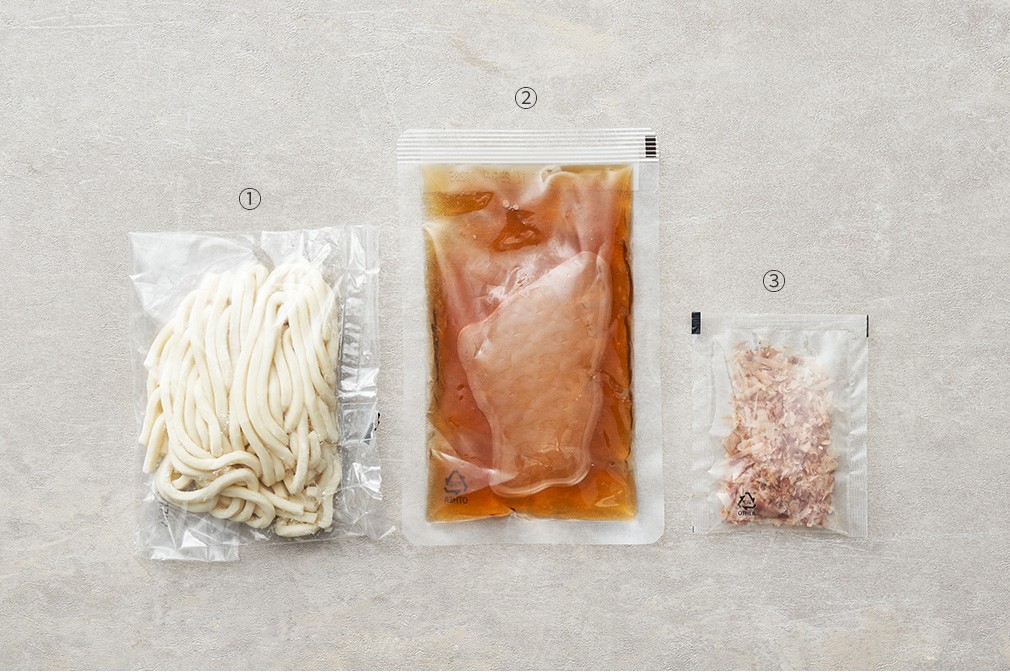 오리지널 우동・구성 :①카덴 우동면(180g),②카덴 우동 소스(100g),③가쓰오(1g)