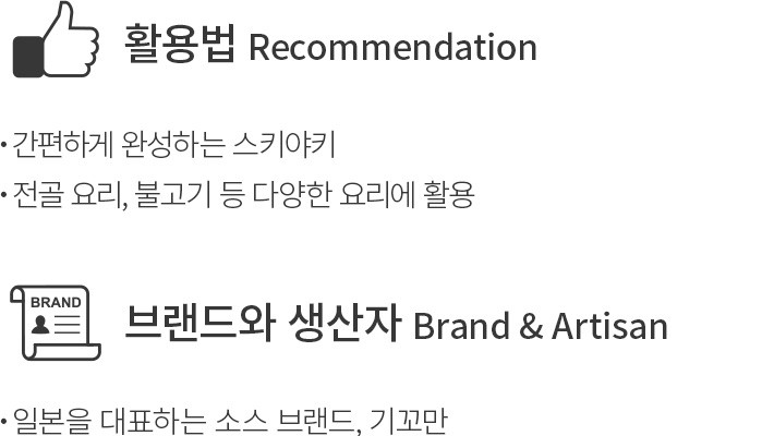 일본을 대표하는 간장 브랜드,기꼬만. 이번에는 손쉽게 스키야키를 완성할 수 있는 소스를 준비했어요. 기꼬만의 노하우로 완성한 간장을 베이스로,미림과 설탕을 알맞게 더해 달큰한 감칠맛이 돋보인답니다. 각종 재료를 넣고 소스와 함께 자작하게 졸이면 풍부하고 깊은 맛이 돋보이는 스키야키를 즐길 수 있지요. 고기와 손질한 채소만 준비하면 되니 더없이 간편하고요. 각종 전골 요리나 간장 불고기를 만들 때 활용해도 참 좋을 거예요.