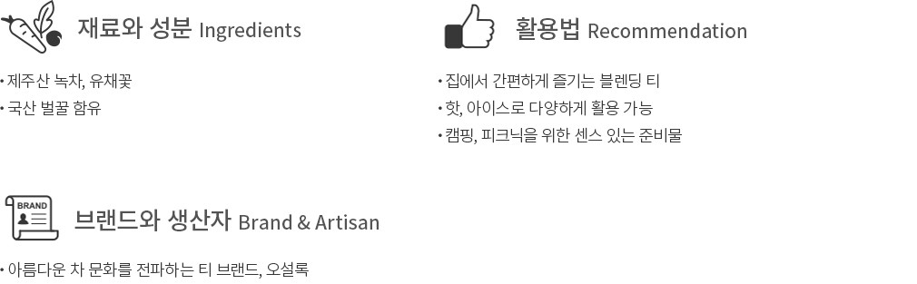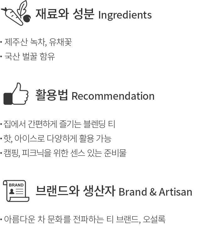 제주의 봄을 닮아 산뜻하고 달콤한 매력을 지닌 제주 유채&살구향 티를 소개할게요. 제주산 녹차와 유채꽃,꿀,살구 향 등을 함께 블렌딩해 만든 제품인데요. 봄꽃을 주 재료로 사용한 덕분에,특유의 화사하고 향긋한 향미가 가득 담겨 완성되었답니다. 티백을 잘 우려낸 뒤,핫이나 아이스 티로 만들어 취향에 맞게 즐겨보세요. 감미로운 향과 맛으로 편안하고 기분 좋은 티 타임을 완성해줄 거예요.