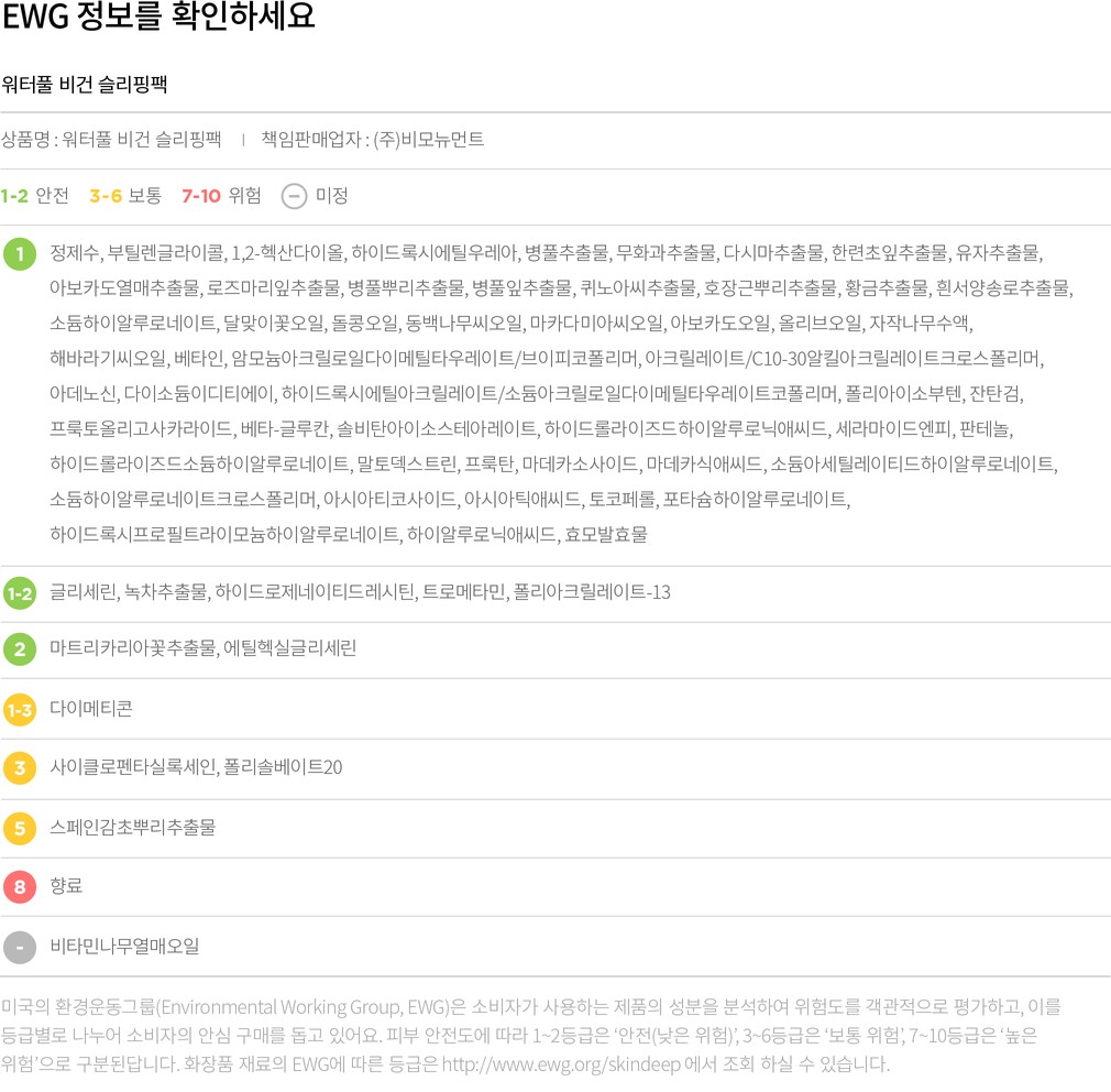 EWG에 대한 컬리의 생각 컬리는 화장품,샴푸,치약,세제 등 우리의 인체에 닿는 리빙 제품의 전성분을 공개하고 성분의 위험 정도를 EWG 기준에 따라 1~10 숫자로 안내하고 있습니다. EWG가 세계적으로 널리 사용되는 신뢰할 수 있는 척도인 것은 맞지만,상품의 안전성을 증명하는 절대적인 기준은 아니에요. EWG로부터 좋지 못한 평가를 받은 성분에 대해 전문가와 유관기관은 '권고 기준치를 지켜 사용할 경우 무해하다'고 평가하기도 합니다. 이에 컬리는 EWG 등급과 인터넷에 떠도는 단편적인 정보에만 의존하지 않고 식품의약품안전처,에코서트(ECOCERT),미국식품의약국(FDA),미국화장품원료검토위원회(CIR)등 공신력 있는 인증기관의 의견을 참고하여 유해성 여부를 꼼꼼하게 따져 보고 있습니다.