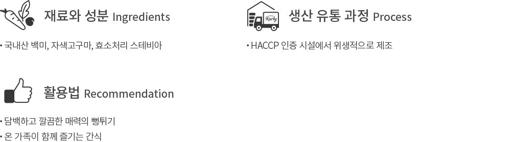 바삭한 식감을 자랑하는 쌀과자,더본푸드의 놀부가 반해버린 자색고구마 쌀뻥을 만나 보세요. 오직 국내산 백미와 자색고구마,효소처리 스테비아로만 만들었답니다. 담백하고 깔끔하면서도 은은한 단맛이 나 계속 손이 가곤 하지요. 조각조각 부서지면서 나는 경쾌한 소리도 뻥튀기 과자의 매력 중 하나예요. 부담 없이 즐기기 좋은 간식이나 아이도 안심하고 먹을 수 있는 과자를 찾으시는 분에게 추천해 드려요.