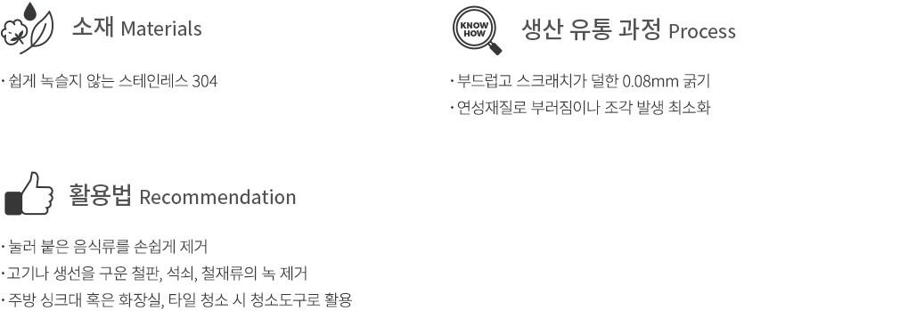 음식을 요리한 철판이나 예쁘게 플레이팅한 그릇에 무언가 눌어붙었다면,이때 필요한 게 바로 철 수세미입니다. 쓰리스타의 철 수세미는 쉽게 녹슬지 않는 스테인레스 304 재질을 사용해 더욱 위생적이에요. 게다가 머리카락과 유사한 0.08mm 굵기로 만들어 한층 부드러운 사용감을 자랑합니다. 작지만 든든한 주방 필수품이니 이번 기회에 챙겨 가세요.