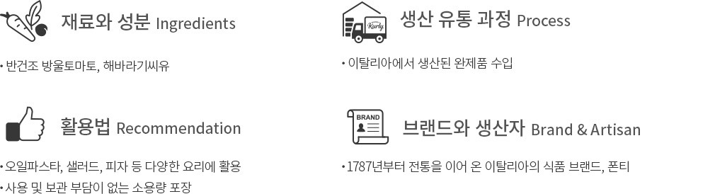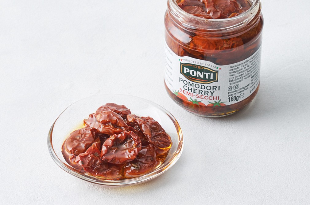 선드라이 토마토는 잘 말린 토마토를 허브,마늘 등의 향 채소와 함께 오일에 절인 저장식품으로,다양한 요리의 완성도를 올려 주는 기특한 식재료지요. 이번에는 방울토마토로 만들어 더욱 특별한 폰티의 세미 드라이토마토를 소개할게요. 반쯤 말린 반건조 방울토마토를 사용해 쫄깃한 식감이 잘 살아 있고,크기가 작아 섭취나 활용도 간편해요. 바질,마늘,오레가노 등을 첨가해 복합적인 풍미를 완성했답니다. 크림치즈와 함께 빵 위에 살짝 올려서 드시거나,파스타부터 피자,샐러드 등에 다채롭게 활용해 보세요.