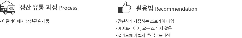요리를 하다 보면 기름을 생각보다 많이 쓰게 되지만,대용량 제품을 사기엔 조금 부담스럽지요. 이탈리아의 프리미엄 오일 브랜드,만토바는 그런 고민을 한 번에 해결할 제품을 만들었습니다. 기름 사용은 적게,맛은 오래 유지되는 오일 스프레이가 바로 그 주인공이죠. 이번에 만나볼 제품은 유기농 올리브를 압착해 한 병에 담은 엑스트라버진 오일 스프레이입니다. 올리브유 특유의 신선하면서도 매콤한 풍미가 잘 살아있어,기름이 필요한 요리는 물론 샐러드에 가볍게 더해도 좋답니다. 원하는 만큼 펌핑 강도를 조절해 다양하게 활용해 보세요.