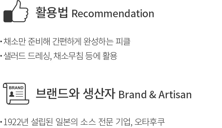 1922년 설립된 일본의 소스 전문 기업,오타후쿠가 선보이는 피클초 식초소스를 소개할게요. 원하는 채소를 준비해 피클초 식초 소스에 담가 주기만 하면,오랜 시간 기다리지 않아도 금세 새콤달콤한 피클이 완성된답니다. 배합초를 만들거나 끓이고 식히는 과정이 필요 없어 더욱 간편하지요. 로즈힙 추출물을 비롯해 월계수,크로브,계피 등의 향신료 추출물로 풍미를 살렸으니 피클뿐 아니라 다양한 요리에 두루두루 활용하기에도 참 좋을 거예요.