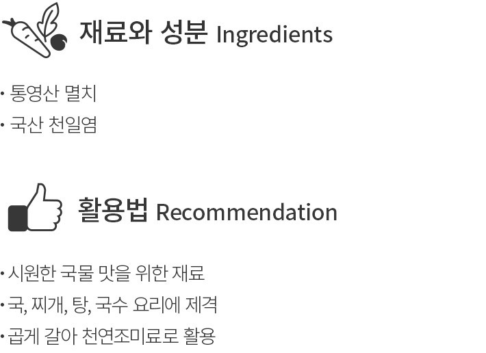 멸치 육수로 끓인 국물 요리는 그 맛의 깊이가 남다르죠. 청정해역 통영에서 잡은 뒤,깨끗하게 건조한 국물용멸치를 만나보세요. 통통하고 큼직한 멸치를 골라,국산 천일염으로 간을 더해 한 봉에 담았답니다. 국이나 찌개 요리를 만들 때 한 줌 넣고 푹 끓이기만 하면 깔끔하고 시원한 국물이 완성되고요. 곱게 갈아 보관해두면 각종 국물 요리에 한 스푼씩 더하는 천연조미료로 요긴하게 쓰일 거예요.