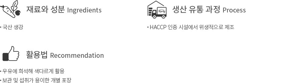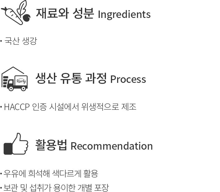 오직 3가지 재료만 넣어 깔끔하게 완성한 담꽃의 생강차를 소개합니다. 국산 생강을 오랫동안 달여 진하게 농축한 다음,생강과 가장 어울리는 흑설탕,계피를 더해 달콤하면서도 은은한 매력을 더했답니다. 따뜻한 물은 물론,찬물이나 우유에도 잘 녹는 묽은 액상 타입이라 더욱 만족스럽지요. 개별 포장된 생강차 스틱 10개입이 들어있으니,언제 어디서나 간편하게 즐기기에도 좋을 거예요.