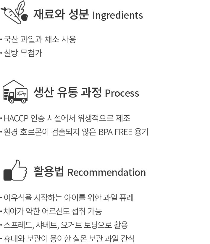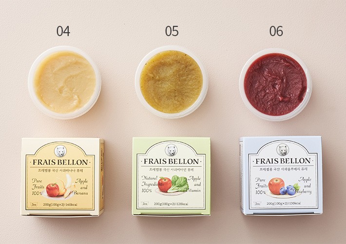 ・특징:국산 사과 100%로 이루어진 퓨레예요. 새콤달콤한 맛 덕분에 과일이 익숙하지 않은 아이들도 거부감 없이 먹을 수 있지요.