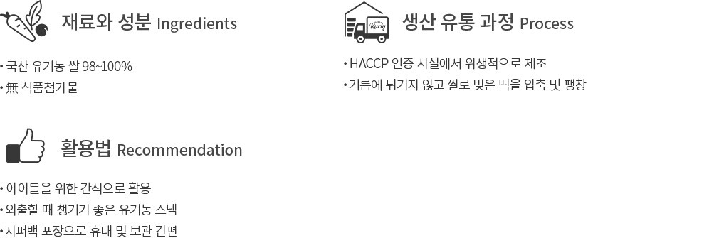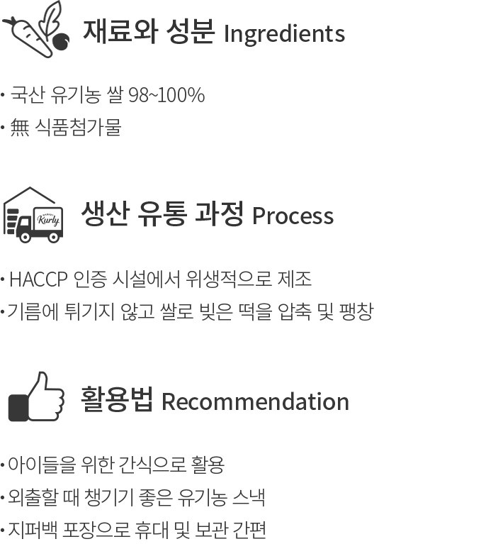 ・특징:오직 국산 유기농 쌀만으로 깔끔하게 만든 백미 떡뻥 과자예요.
