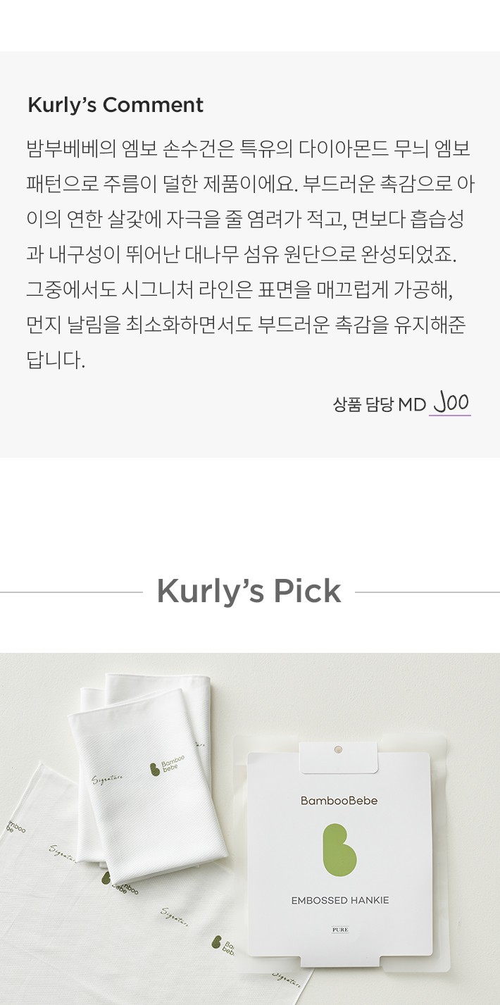 ・ 특징:다이아몬드 모양의 엠보 패턴에 톡톡한 두께감으로 흡수력이 뛰어난 엠보 손수건입니다. 엠보 손수건은 엉덩이나 몸 등 넓은 부위를 닦아내기에 좋아요.