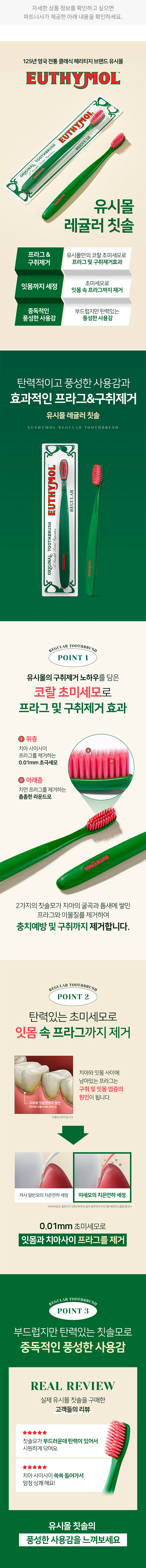 ・특징:진녹색의 핸들,분홍빛 모를 가진 유시몰의 레귤러 칫솔입니다. 규격은 일반적인 칫솔과 비슷해요. 칫솔모가 치아 구조에 맞게 곡선을 그리며 굽어 있어,더욱 꼼꼼한 양치가 가능해요.