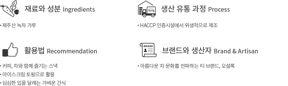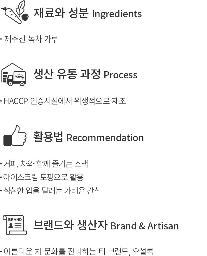 제주에서 뿌리를 내린 오설록,명실공히 한국을 대표하는 차 브랜드지요. 1979년,우리나라만의 고유한 차 문화를 꽃 피우겠다는 창립자의 일념에서 시작되었는데요. 돌과 바람이 전부였던 제주의 돌송이차밭에서 첫 삽을 뜬 이래,자연을 이해하고 극복하며 제주를 상징적인 녹차 재배지로 성장시켰답니다. 이후,현대의 기술을 접목해,더 다양한 품종의 차와 상품들은 물론이고요. 차와 이상적인 조화를 이루는 티 푸드까지 자체 개발해 선보이고 있어요. 언제 어디서나 제주에 온 듯 편안한 휴식을 만끽하고 싶다면,오설록의 문을 두드려 주세요.