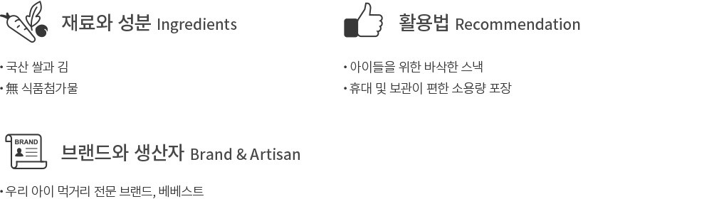 전통 간식 김부각을 아이 간식으로 만나 보세요. 국산 쌀과 김으로 만들어 안심할 수 있는 베베스트 처음먹는 아이 김스낵을 소개합니다. 우리 아이들이 먹는 간식인 만큼 짜지 않고 담백하게 만들었어요. 아담한 크기로 아이가 혼자 쥐고 먹기에도 좋지요. 조금씩 담아 포장했으니 아이와 함께 외출할 때 간편하게 챙겨 보세요.