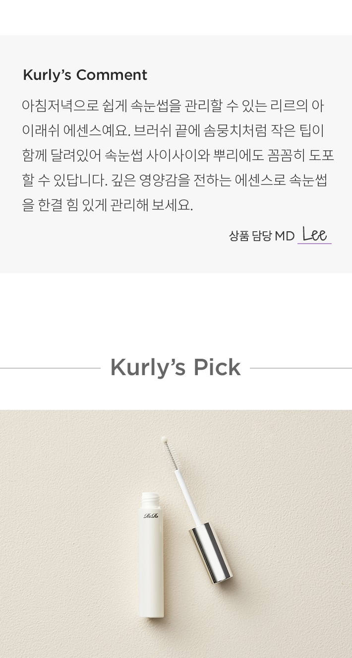 ・ 특징:투명한 제형의 아이래쉬 에센스예요. 마스카라 전 발라주면 한결 풍성한 속눈썹을 연출할 수 있어요.