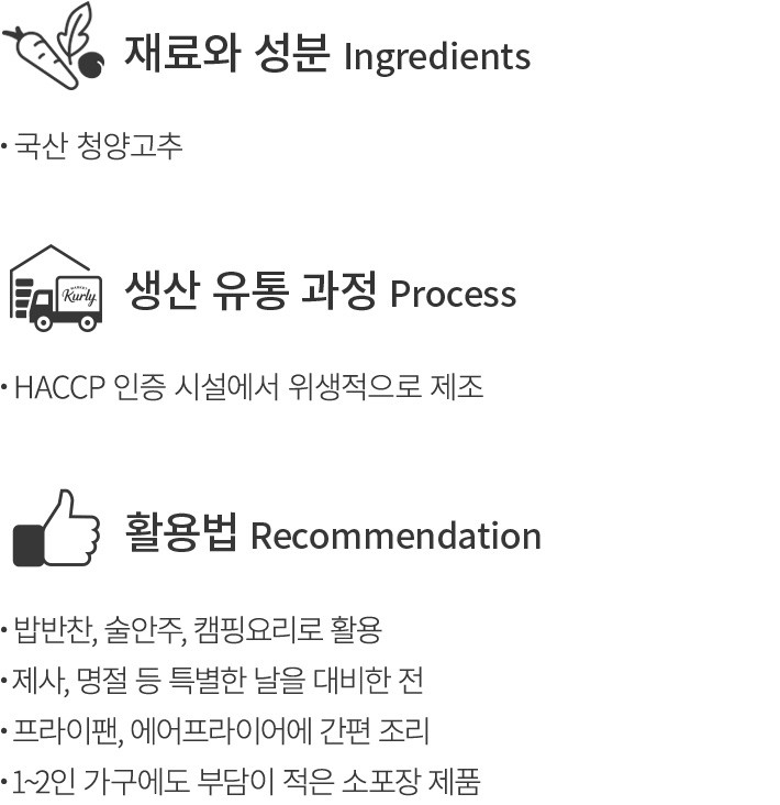 지글지글 소리부터 입맛을 자극하는 전 요리,집에서 만들기엔 조금 부담스러운 것이 사실이에요. 부침명장은 이런 고민을 덜어줄 한입 땡초 부추전을 준비했어요. 데우기만 하면 갓 만든 듯 노릇한 부추전을 맛볼 수 있지요. 반죽에 부추와 오징어,청양고추를 넣고 한 입 크기로 부쳤는데요. 고소한 전 속 매콤한 청양고추가 콕콕 박혀 덕분에 질리지 않고 먹을 수 있답니다. 간단한 밥반찬이나 술안주는 물론,명절용 전,캠핑요리 등으로 다채롭게 활용해 보세요.