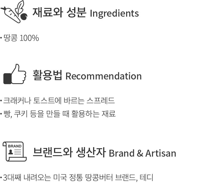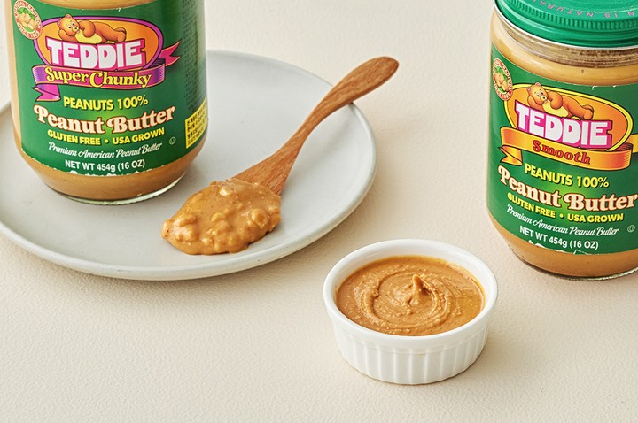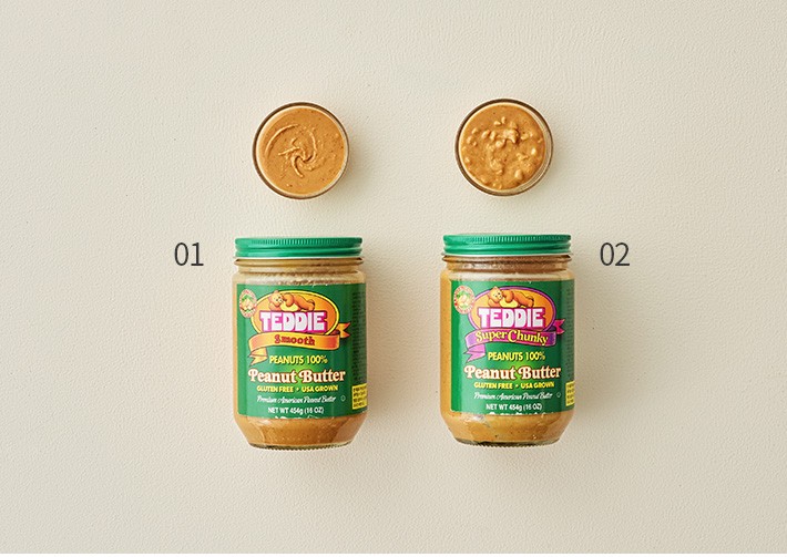 3대째 내려오는 미국 정통 땅콩버터 브랜드,테디가 선보이는 땅콩버터를 소개합니다. 다른 첨가물 없이 땅콩 100%로 만들었기에,달지 않고 고소한 풍미를 그대로 간직하고 있답니다. 부드러운 질감의 스무스와 사이사이 땅콩이 씹히는 슈퍼청크 두 가지 종류 중 취향에 따라 골라보세요. 크래커나 토스트에 바르는 스프레드로 활용하는 것은 물론,베이킹 재료로 활용해도 참 좋을 거예요.