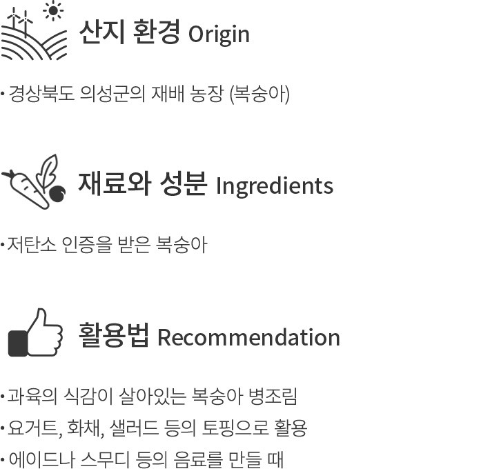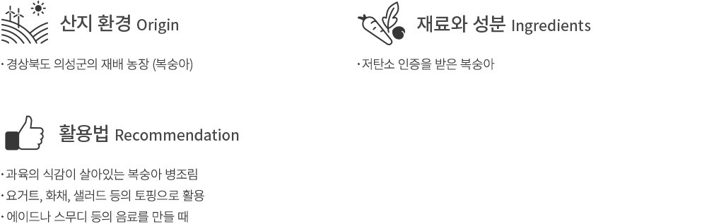 정성을 담은 먹거리를 선보이는 더오담이 이번에는 달콤한 복숭아 병조림을 선보입니다. 국내 복숭아 주산지 중 하나인 경북 의성군에서 재배한 복숭아로 만든 제품인데요. 온실가스 배출을 줄이는 농법으로 생산한 저탄소 인증 복숭아를 사용했기에 더욱 믿고 먹을 수 있죠. 뽀얀 과육을 자랑하는 달콤한 백도라,입안 가득 부드러운 식감까지 매력적이랍니다. 요거트나 샐러드를 위한 산뜻한 토핑으로 활용해 보세요.