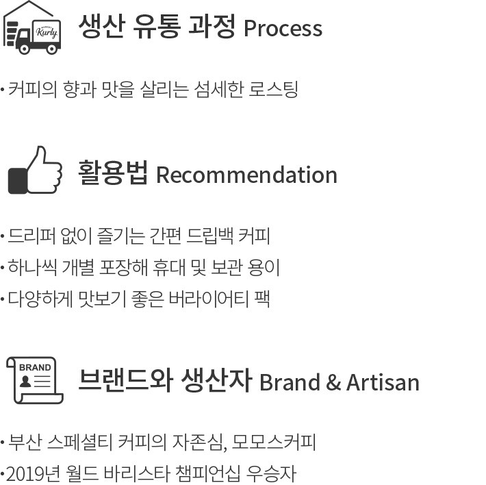 ・특징:붉은 보랏빛 수채화가 연상되는 베리 풍미를 지닌 블렌드 드립백입니다. 초콜릿을 닮은 묵직한 단맛으로 훌륭한 밸런스를 완성했어요.