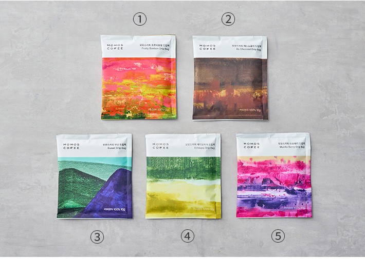 버라이어티 드립백・구성:①프루티 봉봉,②에스 쇼콜라,③부산,④에티오피아 레도 마운틴,⑤므쵸베리