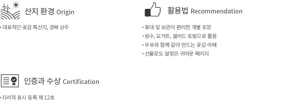 대표적인 곶감 특산지,경북 상주에서 온 곶감을 만나보세요. 오랜 노하우로 말린 곶감답게 겉은 쫀득하고,속은 진득한 달콤함이 느껴진답니다. GAP 인증을 받은 제품이니 더욱 안심하고 먹을 수 있지요. 5개를 각각 개별 포장하여 출출할 때마다 한 개씩 챙기는 간식으로도 좋고요. 귀여운 감이 그려진 패키지에 담아 보내 드리니,마음을 전하는 선물로도 알맞을 거예요.