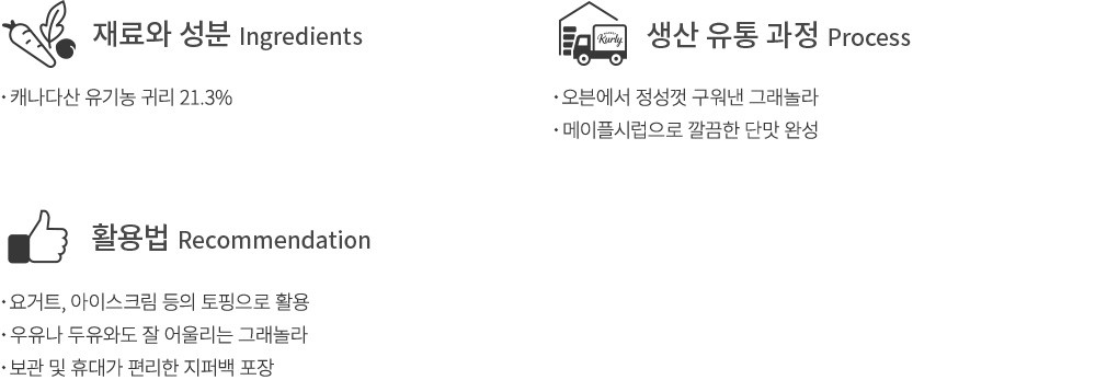 꾸덕한 그릭요거트로 사랑받고 있는 그릭데이가 이번에는 요거트와 가장 잘 어울리는 바삭한 그래놀라로 컬리를 찾아왔어요. 고소한 귀리를 베이스로 피칸,캐슈넛,마카다미아 등 다채로운 견과를 배합해 완성했답니다. 여기에 시나몬 분말로 향긋함을 더하고,건조 무화과를 넣어 쫀득한 식감까지 놓치지 않았지요. 오븐에서 정성껏 구워냈으니 더욱 진한 풍미를 맛볼 수 있을 거예요. 그릭데이의 요거트에 살짝 얹어 드시거나 아이스크림,샐러드 등의 토핑으로 활용해 보세요.