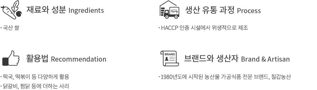 칠갑농산은 충남 청양군 칠갑산 자락에 위치한 농산물 가공식품 브랜드예요. 50여 년의 전통과 노하우로 만든 각종 면과 떡,간편식 등의 제품으로 익히 유명한 곳이죠. 이번에는 앙증맞은 모양이 매력적인 조랭이떡을 준비했어요. 국산 쌀로 만들어 더욱 안심하고 즐길 수 있는 것은 물론,쫀득한 식감 또한 살아있답니다. 떡볶이,떡국 등 다양하게 요리해보세요. 닭갈비나 찜닭에 더해 즐겨도 참 좋을 거예요.