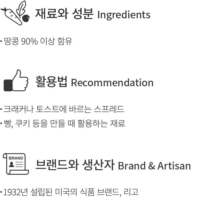 고소한 달콤함이 묵직하게 녹아든 땅콩버터. 빵이나 크래커 등에 슥슥 바르는 스프레드로는 물론,다양한 요리에 한 스푼씩 더해 풍미를 끌어올리기에도 좋지요. 지금 소개하는 리고의 땅콩버터는 땅콩을 90% 이상 함유하고 있어 더욱 진하고 깊은 맛을 자랑하는데요. 땅콩 알갱이가 들어 있어 오독오독 씹히는 청키한 식감까지 아주 매력적이랍니다. 스프레드부터 베이킹 재료까지 두루두루 활용해 보세요.