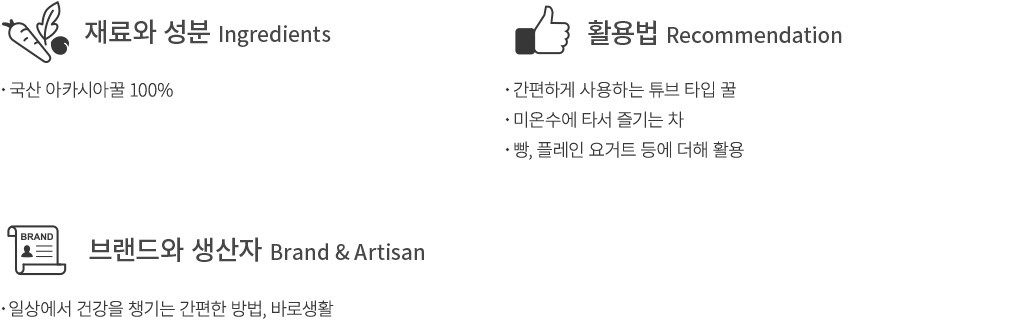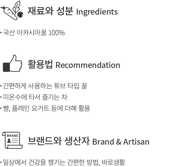 다양한 음식에 달콤함이 필요한 순간,지금 소개하는 바로생활의 꿀을 선택해보세요. 지금 만나볼 제품은 국산 아카시아꿀을 사용해 은은한 달콤함이 돋보이는 꿀이에요. 향긋하게 감도는 꽃향기는 물론,부드럽게 녹아드는 질감 덕분에 두루두루 활용하기 참 좋답니다. 튜브 타입이라 원하는 만큼 간편하게 사용할 수 있지요. 물에 타서 차로 드시는 것은 물론,빵이나 플레인 요거트 등에 더해 즐겨도 좋을 거예요.