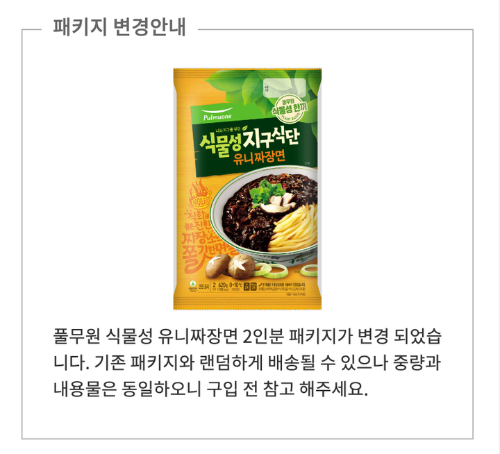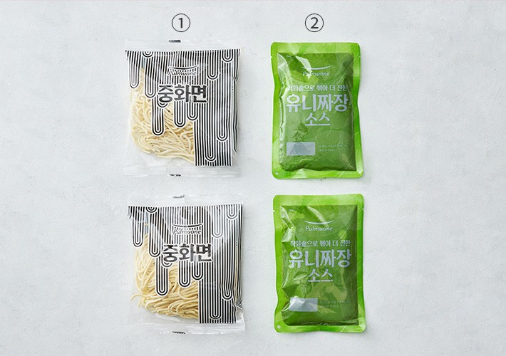 식물성 유니짜장면?구성 :①중화면(140g X 2봉),②유니짜장소스(170g X 2봉)