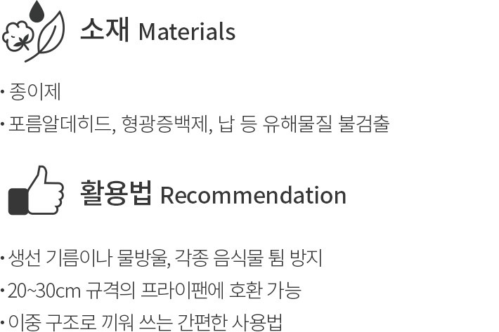 ・특징:조리 시 각종 음식물 튐으로부터 보호해줄 종이 덮개입니다. 20~30cm 크기의 프라이팬에 호환됩니다.