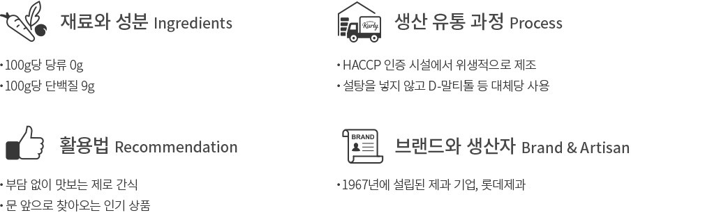 세대를 뛰어넘어 오랜 기간 사랑받아 온 제과 브랜드,롯데제과가 이번에는 당류 걱정 없이 즐길 수 있는 간식을 선보입니다. 당 섭취를 줄이기 위한 ‘제로’ 프로젝트의 일환으로,설탕 대신 대체 감미료로 단맛을 내었는데요. 지금 소개하는 제품은 무설탕 초콜릿 칩이 콕콕 박혀 있는 바삭한 쿠키예요. 설탕은 사용하지 않았지만,진한 달콤함만큼은 놓치지 않았답니다. 마음의 부담을 덜어 줄 롯데제과의 제로 간식을 컬리에서 만나 보세요.