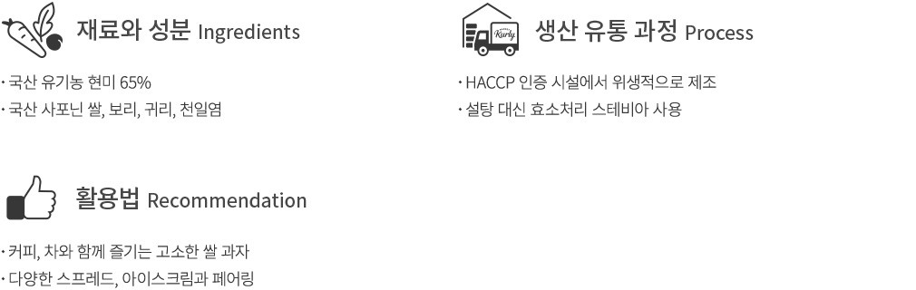 튀기지 않고 바삭하게 구워 만든 쌀과자는 남녀노소 모두가 좋아하는 간식이지요. 지금 소개하는 쌀 구움 과자는 국산 유기농 현미를 65% 사용해 만든 제품인데요. 여기에 사포닌 성분을 함유한 쌀인 사포닌 쌀과 보리,귀리를 배합해 더욱 고소하게 완성했답니다. 약간의 천일염과 효소처리 스테비아로만 간을 맞추어 깔끔하고 담백한 맛을 자랑하죠. 켜켜이 담아낸 쌀과자 두 봉을 함께 포장해 보내 드리니,입이 심심한 순간을 위해 선택해 보세요.