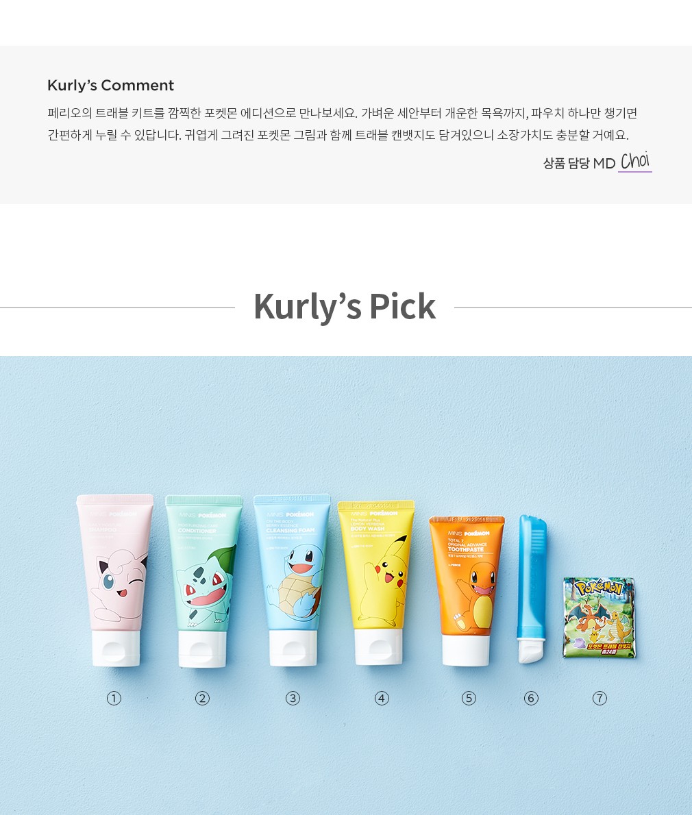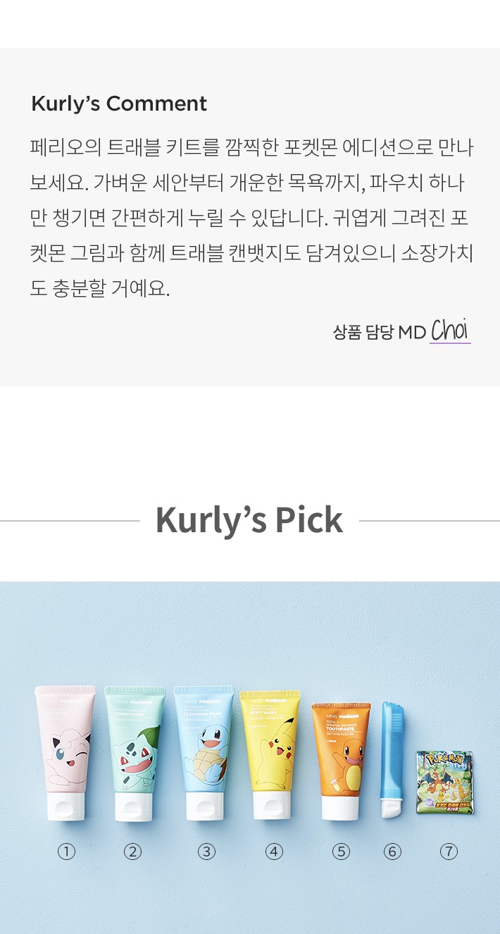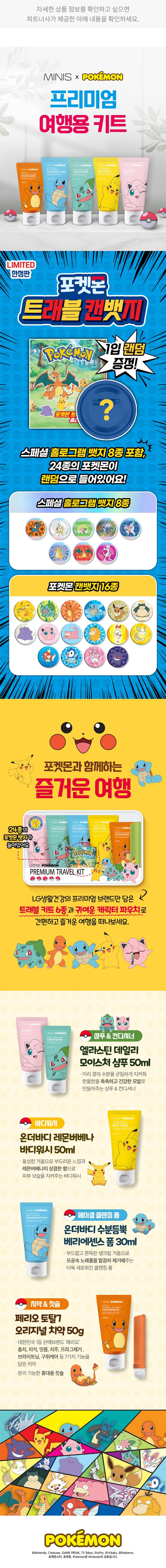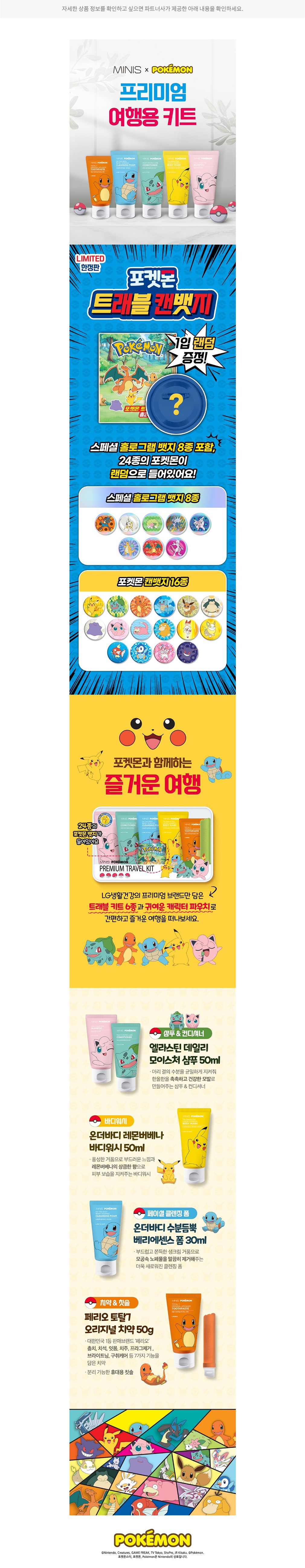 여행용세트 미니스 포켓몬・ 구성:①엘라스틴 샴푸,②엘라스틴 컨디셔너,③온더바디 클렌징폼,④온더바디 바디워시,⑤페리오 치약,⑥페리오 여행용 칫솔,⑦포켓몬 캔뱃지